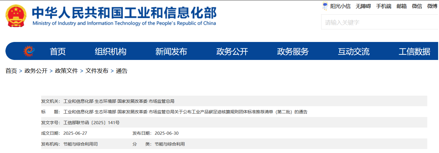 工業和信息化部等四部門關于公布工業產品碳足跡核算規(guī)則團體標準推薦清單(第二批)的通告 詳細>>